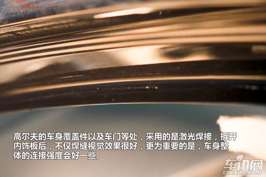 而且很遗憾的是在新速腾的门框上采用了点焊设计,并没有实用激光焊接,而高尔夫的车身覆盖件以及车门等处,采用的是激光焊接,拆开内饰板后,不仅焊缝视觉效果很好,更为重要的是,车身整体的连接强度会好一些。也就是俗话所说的更为结实。这点也是新速腾的一处缩水。