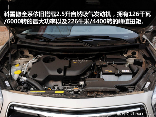 动力方面,2012款科雷傲沿用了老款的2.5L直列四缸自然吸气发动机,具有低扭输出动力良好的特点,与日产奇骏搭载的是同一款。但不同的是,科雷傲的发动机产地在韩国,所以调教上也和奇骏的存在一定差别,发动机的最大功率为126千瓦,峰值扭矩为226牛米,相比奇骏略低了一些,不过在实际驾驶时几乎不会有区别。科雷傲搭载的6挡CVT变速箱提速平顺,并且有相对良好的燃油经济性,2.5L发动机+CVT变速箱的动力组合让科雷傲天生就成为一个好开、舒服的城市型SUV。