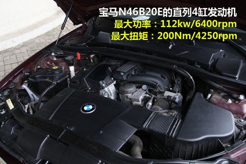 320i搭载了一台型号为N46B20E的直列4缸发动机,此款发动机采用了电子气门控制系统(VALVETRONIC)和Double-VANOS双凸轮轴可变气门正时系统,在6400转时可以爆发出112kw的最大功率,200Nm的最大扭矩则出现在4250转时。从书面参数上看,宝马320i搭载的2.0L发动机要好过其他同级排量的自然吸气发动机。