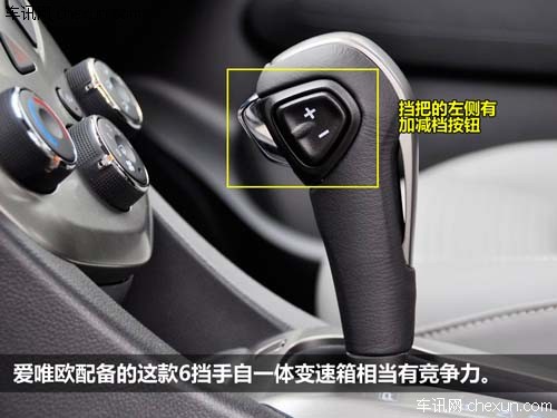 爱唯欧配备了通用旗下先进的两款小排量发动机,其中型号为S-TEC III的1.4L发动机最大功率为76千瓦,峰值扭矩为131牛米,而1.6L Ecotec DVVT发动机的最大功率更是达到了89千瓦,峰值扭矩为155牛米,具有领先于同级竞争对手的功率和扭矩表现。与发动机相匹配的是5挡手动或者6挡手自一体这两种变速箱型式,其中6挡手自一体变速箱是爱唯欧身上的另外一个亮点,挡把的左侧还有一个加减档按钮。在这个价位区间内配备有如此先进变速箱的小型车,除了大众POLO和斯柯达晶锐,剩下的也就只有爱唯欧了。