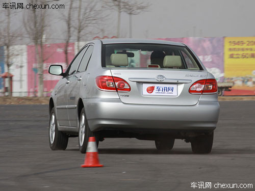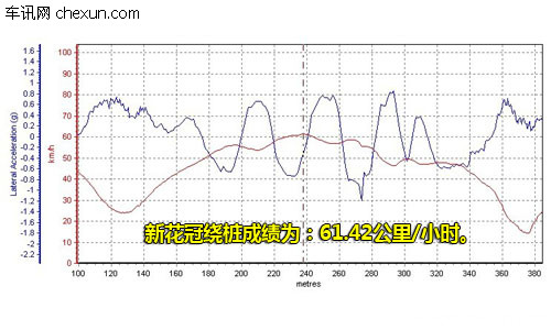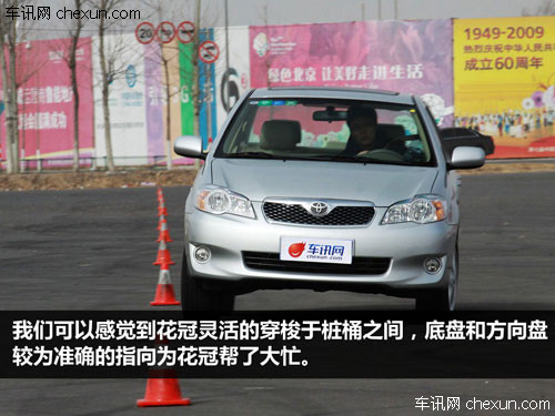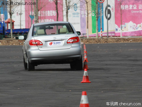 加速和制动的差强人意在接下来的绕桩环节有很大改变。经过几轮测试,花冠的绕桩成绩最终被定格在61.24公里/小时。我们可以感觉到花冠灵活的穿梭于桩桶之间,底盘和方向盘较为准确的指向为花冠帮了大忙。