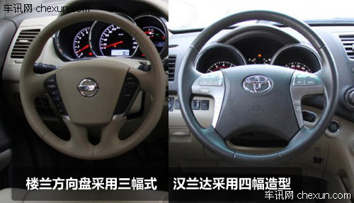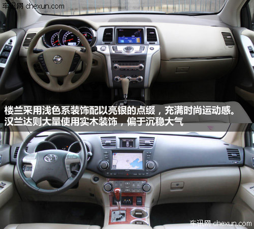 内饰方面,楼兰采用浅色系装饰配以亮银的点缀,充满时尚运动感。而汉兰达则大量使用实木装饰,偏于沉稳大气。