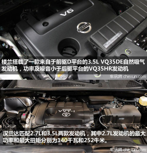 动力方面,以高配车型为例,楼兰搭载的3.5L双凸轮轴V6引擎,最大功率228KW,最大扭矩327Nm。与其搭配的将是第二代Xtronic CVT无级变速箱,可较上一代变速系统可减少10%的油耗。。而汉兰达尽管也搭载一款3.5L发动机,但在功率上却只有201KW,稍逊楼兰一筹,不过在最大扭矩方面达到337Nm,又为自己扳回一局。