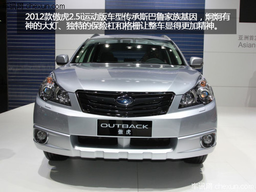 2012款傲虎2.5i运动版车型外观风格动感强悍,车内空间宽大。新车是在2.5i豪华版车型的基础上,加装了18英寸铝合金轮圈、铝合金运动踏板、银色车顶行李架、黑色进气格栅等更具运动化的装备。从前脸来看,傲虎的大灯高高上调,很有杀气,而侧面并没有复杂的修饰线条,略显平和的外表能适合更为广泛的人群。