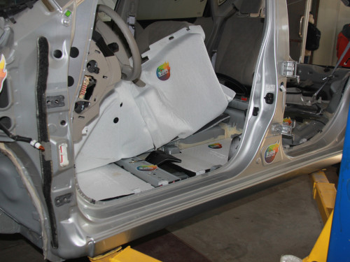 因为,打开汽车地毯之后,发现骐达车内地毡的下面,铺设着大面积的泡沫塑料,尽管某些泡沫塑料(比如聚氨酯)通过添加阻燃剂的手法,可以降低燃烧速度,控制燃烧范围,但对于车内人员的保护来说,这种材质可能并不乐观。