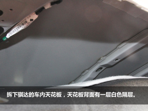 骐达的天花板内,金属顶棚上并无上述隔层,而是在天花板的背面,覆盖着一层可以隔音、隔热的隔层,美中不足是隔层较为单薄。