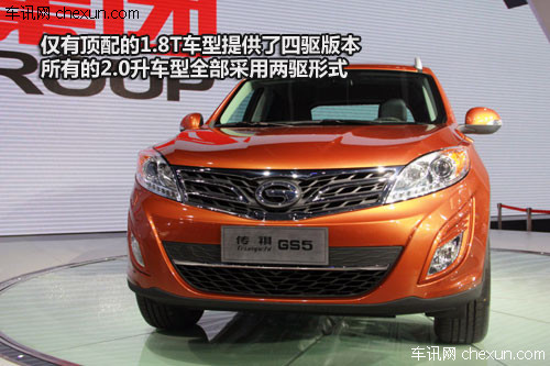 作为一款城市SUV车型,传祺GS5同样会提供两驱和四驱两种驱动形式的版本,但是和发动机的配备方式一样,仅有顶配的1.8T车型提供了四驱版本,所有的2.0升车型全部采用两驱形式。这样的选择倒是很符合城市用车的理念,但是2.0升车型完全不提供四驱版也有些说不过去,希望传祺GS5能够在后续车型中加入2.0升的四驱车型。