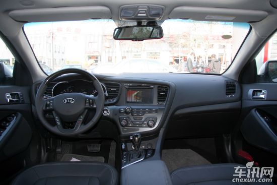 K5车内充斥着运动的氛围,深色的内饰,向驾驶员一侧倾斜的仪表台,完全就是从驾驶者的角度出发,全黑的内饰非常酷,和简洁凌厉的外形内外呼应。中央仪表盘并未使用左右对称的设计,首先是一个有触摸功能的大屏幕,涵盖了DVD播放系统、倒车视频影像和GPS卫星导航系统,下面是空调和音响控制系统,相对比较简洁,使用红色的按键背景光,配合全黑内饰充满了激情。