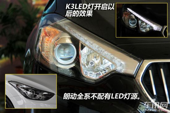 车灯部分是K3的一个优势,LED灯源的加入成为了K3点睛之笔。K3的高配车型还增加了氙气大灯,这也是朗动所不具备的。
