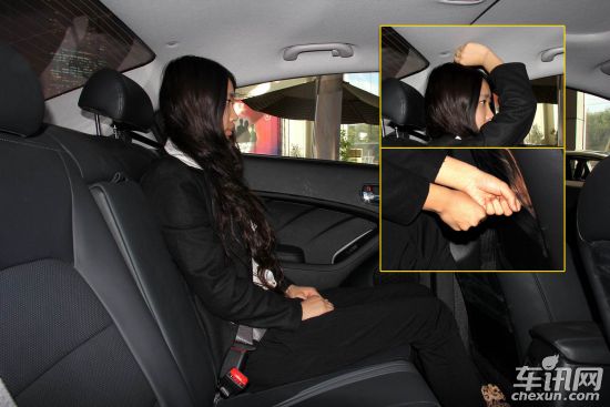 前排空间,169cm身高的模特头部留有一拳,后排头部拥有一拳空间,腿部空间很宽裕有两拳多。