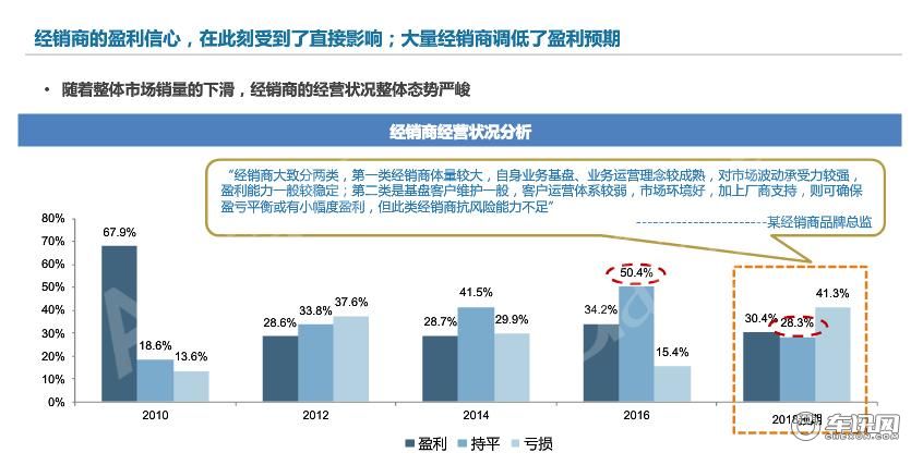 从近几年的数据可以看出,2016年时经销商的预期盈利目标是增长50.4%,到了2018年时,这种预期值已经降到28.3%,2019年,越来越多的经销商采取了更加保守的市场态度,更有甚者认为能够生存下去,就已经是一种胜利。
