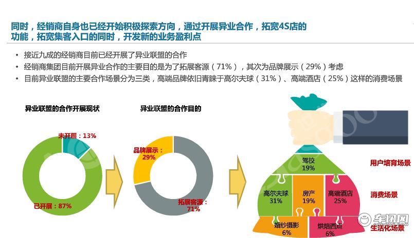 当然,经销商自然也要积极探索新的方向,异业合作可以拓宽4S店的功能,集客的同时也能找到新的业务盈利点。目前有一些经销商已经在借鉴海外市场的运营理念,寻求各个业务领域的协同发展,并重塑门店都得业务运营理念,使之紧密捆绑用户的全生命周期。