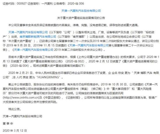 根据目前注册的资料信息显示:天津博郡成立于2019年11月18日,25.340万人民币注册资本,其中南京博郡以现金出资20.34亿元,持股占比为80.1%,一汽夏利以整车相关土地、厂房、设备及负债等非现金物质作价5.05亿元,公司持股比重达到19.9%。