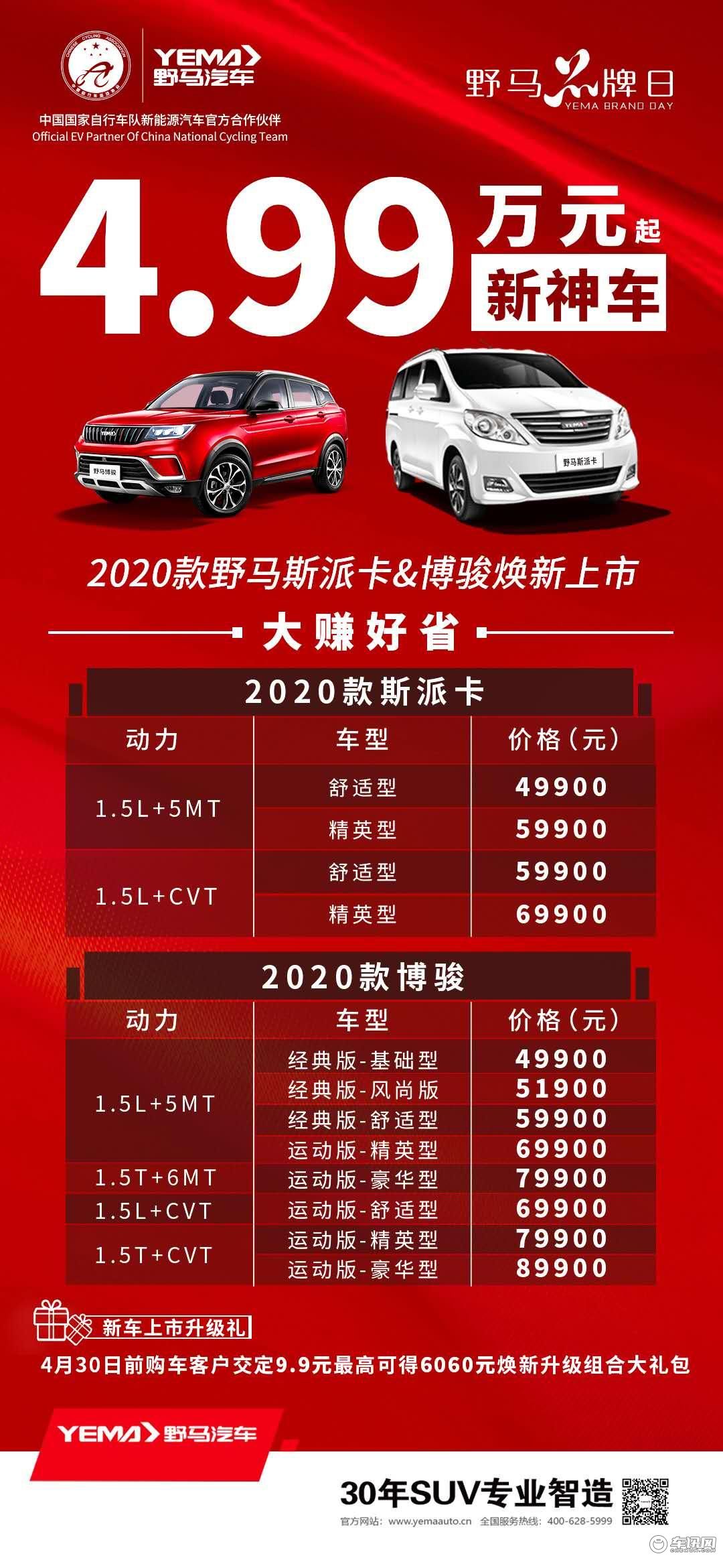 3月27日,四川野马汽车在野马汽车绵阳制造基地云发布了2020款博骏&斯派卡。