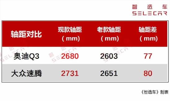 大众系MQB平台下的紧凑型车,分别有Q3、全新速腾以及A3。现款Q3相较老款Q3轴距增加了77mm;现款速腾轴距相较老款速腾轴距增加了80mm。参考Q3和速腾的轴距变化,以此可以判断,A3L的增加轴距同样会在70mm或80mm之间徘徊。