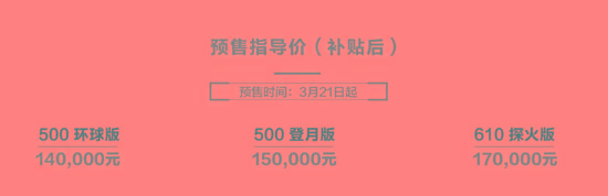 动力部分,本次预售的三款车型均搭载永磁同步电机,500环球版/登月版最大功率120千瓦,峰值扭矩210牛·米;600探火版最大功率150千瓦,峰值扭矩310牛·米。