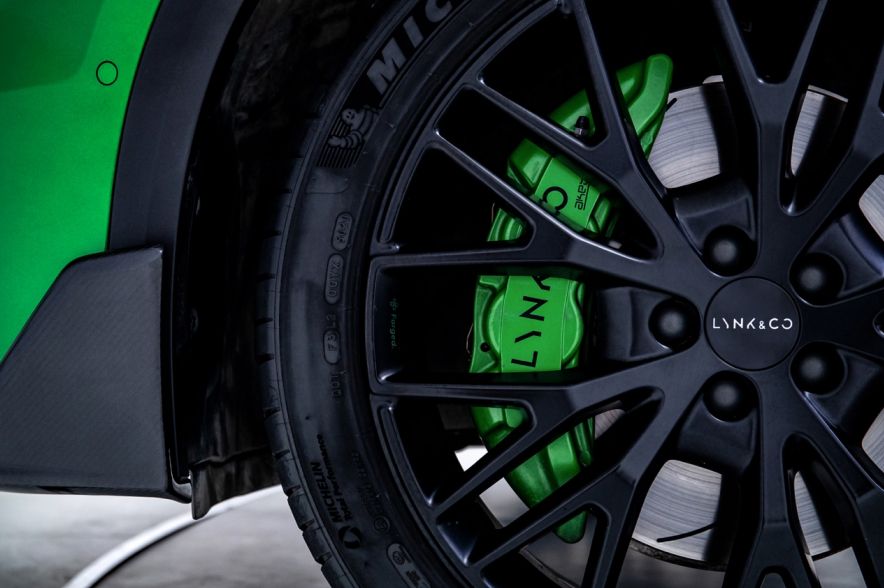 来自中欧的高级调校团队对领克05+的底盘悬架、转向、油门等进行了赛车级的调校,匹配同级超大尺寸前划线刹车盘(360mm)、AKEBONO(阿基波罗)前四活塞刹车定钳、255mm米其林PS4S高性能轮胎(255/40ZR20)等性能装备,以及20英寸深林之戟熏黑锻造轮毂,百公里制动距离最短可达超跑级34m【注】。
