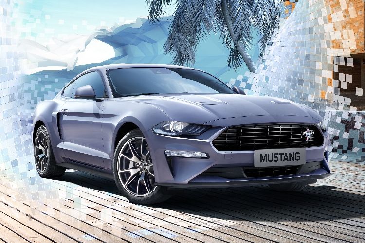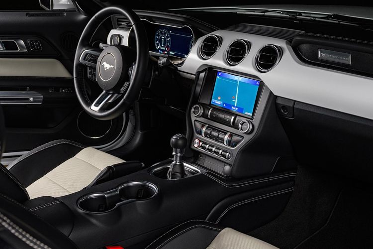 新车以高光黑色前格栅、红白蓝三柱Mustang标识、白色引擎盖拉花设计、后翼子板进气口饰件、19英寸哑光黑高级铝制轮圈等,完美展现了车身肌肉感。内饰套件则包括专属寰海蓝天铭牌与发光门槛踏板。