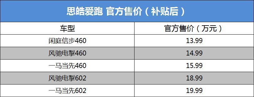 【陕西购车網讯】7月28日,思皓爱跑通过线上形式正式上市,全系共推出5款车型,补贴后的官方售价区间为13.99-19.99万元,思皓爱跑定位于紧凑级纯电动轿车,有着年轻化,运动化的风格,在续航方面,则将提供460公里和602公里两个版本可选。