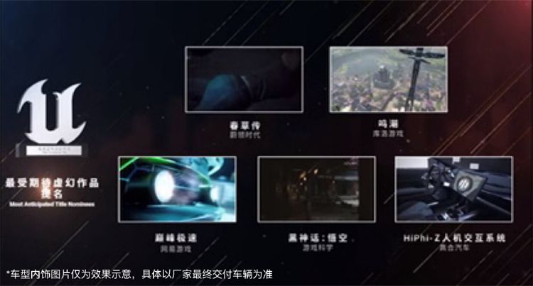 此次年度“ 最受期待虚幻作品 ” 一共有5项提名,分别是:网易的《巅峰极速》、游戏科学的《黑神话:悟空》、库洛的《鸣潮》、高合汽车《HiPhi-Z 人机交互系统》以及蔚领时代的《春草传》,高合汽车是唯一获得提名的汽车作品。