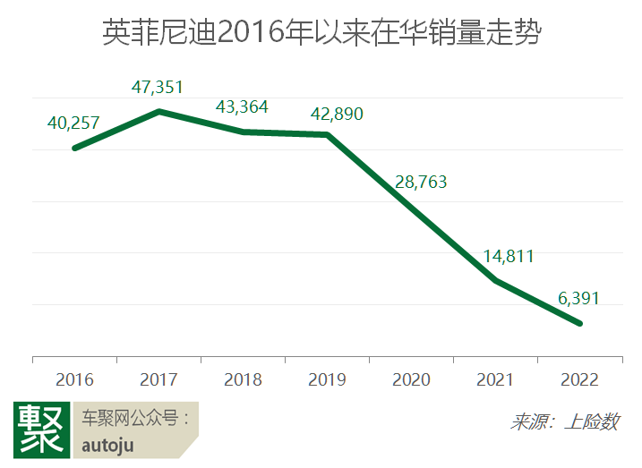 同样实现国产,但英菲尼迪的业绩表现显然也未达到预期,在国内豪华品牌处于第三阵营,近些年销量更是开启“连降”模式,逐渐边缘化。数据显示,英菲尼迪2018年起开启“连降”模式,由2017年的47,351辆逐年降至2022年6,391辆。