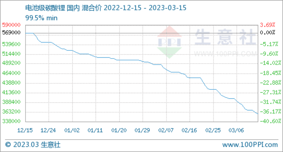 从国内机构生意社的数据来看,碳酸锂的价格在持续走低。3月15日,电池级碳酸锂基准价为35.9万元/吨,相比本月初的40.8万元/吨下降了12%,相比去年11月60.9万元/吨的价格高点更是跌了41%。