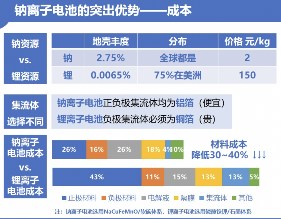 因为资源丰富,钠的价格也很实惠,2元/kg。而锂的价格是150元/kg。钠离子电池的材料成本要比锂离子电池降低30%-40%。