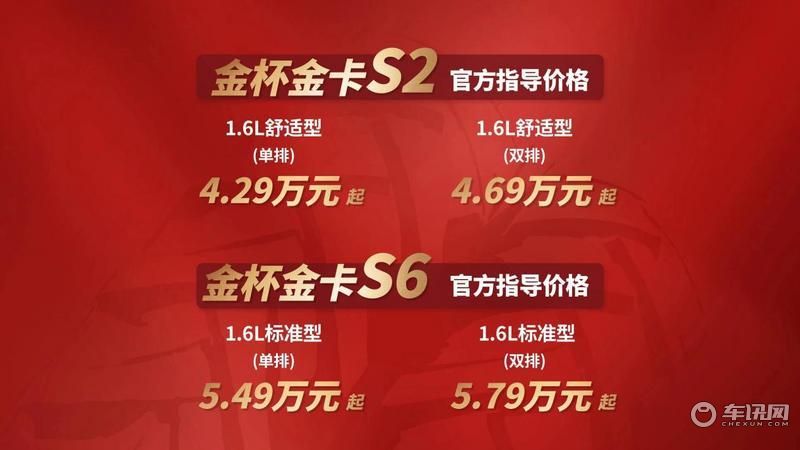 3月21日,在浙江义乌国际赛车公园,鑫源金杯品牌旗下两款旗舰型微卡金杯金卡S2/S6正式上市发布。两款新车共计4个配置,其中金杯金卡S2,定位是“节油王”,舒适型单排售价4.29万,双排售价4.69万。金杯金卡S6定位于“重载王”,标准型单排售价5.49万,双排售价5.79万。