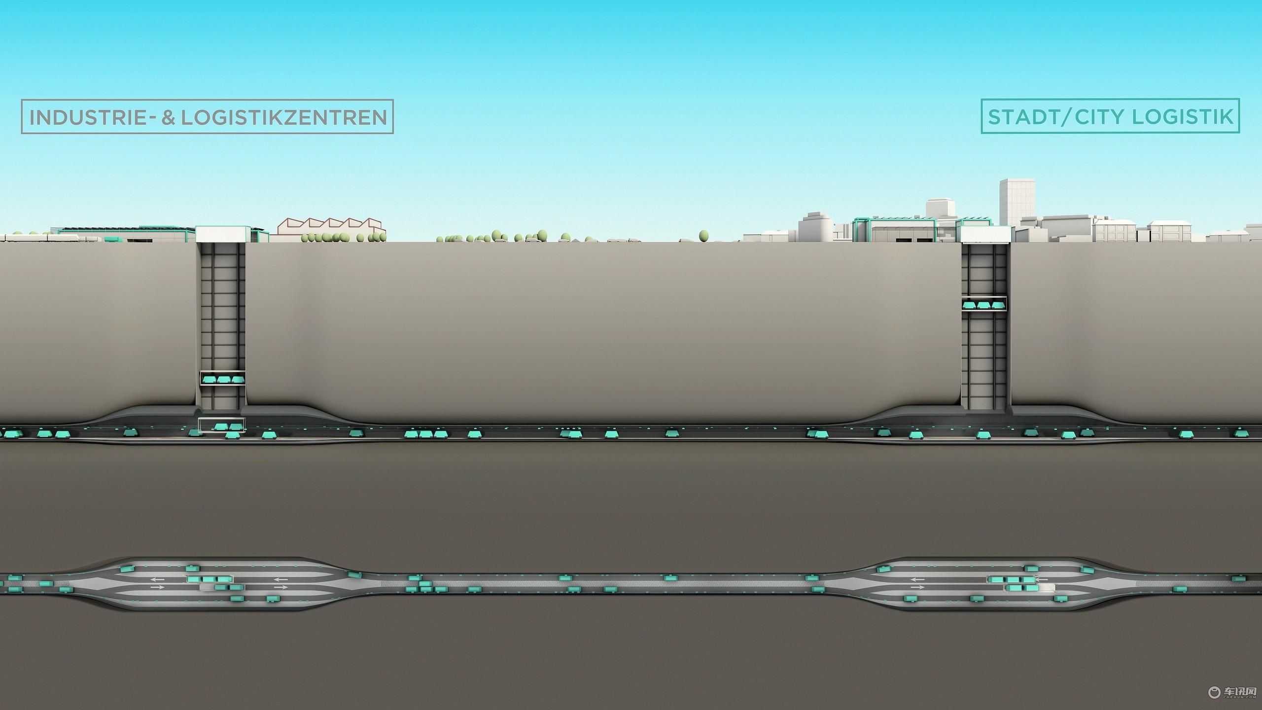 货运小车将在地上的物流设施中进行装载工作,然后通过一部电梯下降到隧道系统的上下匝道部分。隧道的外部车道将是单向的,而内部车道可以进行双向动态配置,以防止在大量货运小车等待电梯时出现交通拥堵。