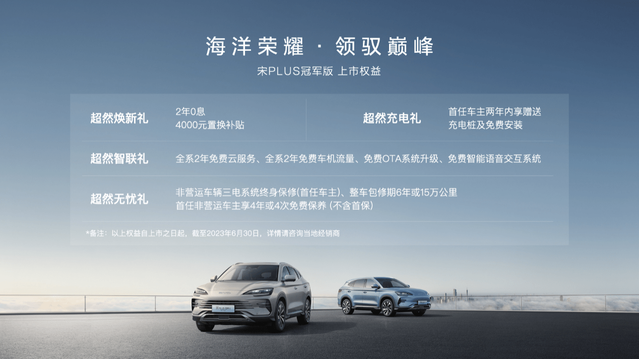 宋PLUS冠军版超然进阶,焕新而来,以全面进阶的冠军产品力,满足用户对高价值SUV的期待,将紧凑型SUV的出行体验提升至全新高度,树立起15-20万元SUV市场的价值新标杆,进一步夯实宋PLUS车型新能源SUV市场冠军地位。自6月19日起,订车即可享受多重权益大礼,用户可以通过比亚迪汽车APP或小程序线上下订,也可到店亲身体验冠军产品的无穷魅力。月19日起,订车即可享受多重权益大礼,用户可以通过比亚迪汽车APP或小程序线上下订,也可到店亲身体验冠军产品的无穷魅力。