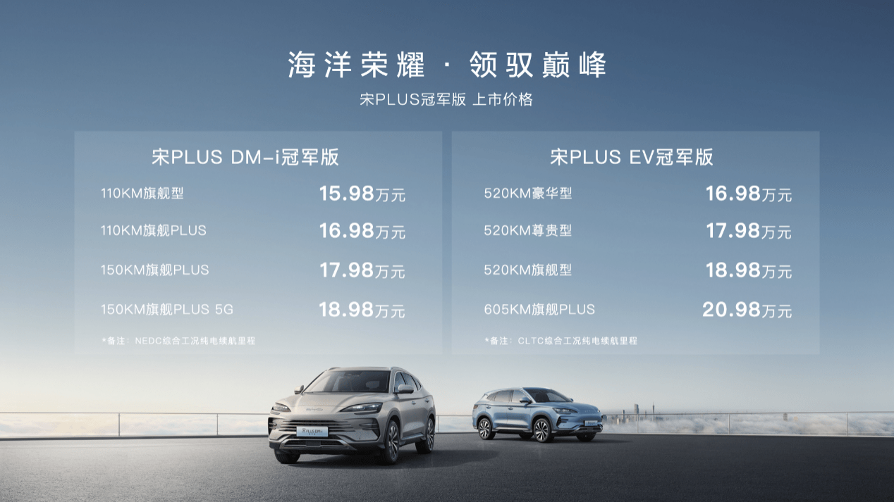 宋PLUS冠军版超然进阶,焕新而来,以全面进阶的冠军产品力,满足用户对高价值SUV的期待,将紧凑型SUV的出行体验提升至全新高度,树立起15-20万元SUV市场的价值新标杆,进一步夯实宋PLUS车型新能源SUV市场冠军地位。自6 6月19日,比亚迪海洋网重磅冠军车型——宋PLUS冠军版正式上市,其中宋PLUS DM-i冠军版共4款车型,售价15.98万元-18.98万元,宋PLUS EV冠军版共4款车型,售价16.98万元-20.98万元。同时为用户准备了2年0息、置换补贴、充电桩、首任车主非营运车辆三电终身保修等多项购车好礼,让冠军产品惠及更多用户。