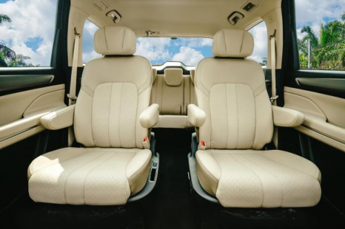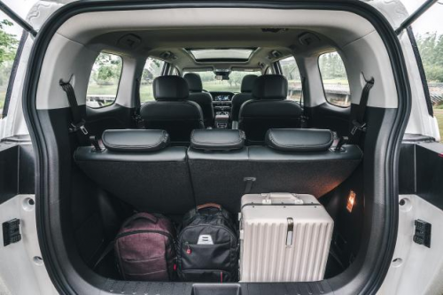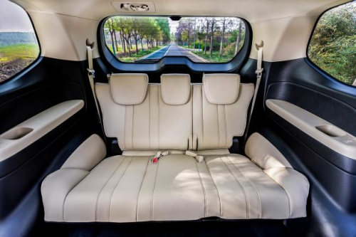 全车座椅采用人体工学全贴合舒适座椅,二排独立式座椅带扶手可躺,配备4级调节扶手,座椅可前后滑移,加之双弧面蝶翼式设计头枕,大大提升了乘坐的舒适性。此外二排中央通道为170mm,让 3排乘客进出从容自如,同时3排座椅椅背还支持多级调节,前后调节角度达 23.2°,并且仿照人体休息时的休闲坐姿设计座椅,座垫倾斜角度给予腿部完全的支撑,使得三排乘客也能舒适自如。此外,第三排可翻转魔术座椅折叠后座椅椅背与地毯齐平,后备箱可扩展至1100L的巨大储物空间,大大提升了空间的利用率和多变性。