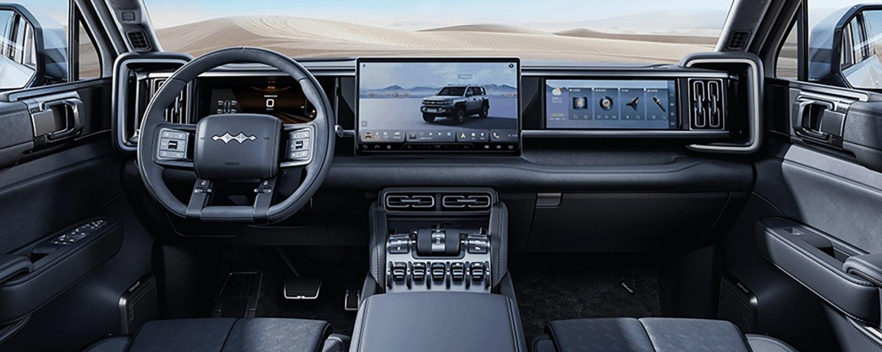 驾驶舱中,城市版豹5搭载15.6英寸2.5K高清触控屏,中控屏两侧是12.3英寸的液晶屏,用作仪表显示和副驾驶操控屏,这在强调真正越野性能的车型上,很少见。不管是硬件还是软件,豹5的大屏,都能与以科技感见长的纯电车型媲美。