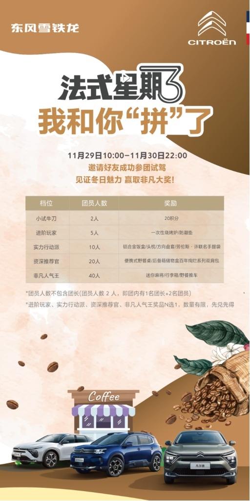 11月29日10点-11月30日22点,在东风雪铁龙小程序/APP开团,邀请好友成功参与拼团试驾,即可赢取非凡大奖!便携式野餐桌、后备箱储物盒、百年绚烂系列双肩包、行李箱、野餐推车等众多奖品等你来拿,来来行动起来吧!
