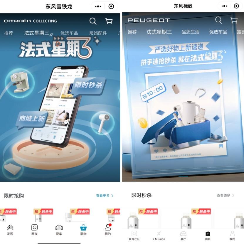 不仅如此,东风雪铁龙、东风标致小程序/APP“法式星期三”专区,还限时限量上架了石墨烯暖风机、保温杯垫、多功能旋转置物架、摩飞榨汁杯300ml、吹风机、暖手充电宝等40余款精美商品,先到先得。更有5款严选好物限时秒杀,3积分即可带回家!
