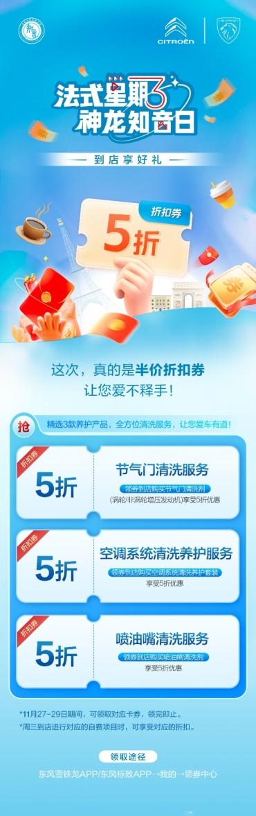 11月27-29日期间,东风雪铁龙、东风标致还为知音伙伴精选了节气门清洗服务、空调系统清洗养护服务、喷油嘴清洗服务3款养护产品,全方位清洗服务,让您爱车有道!更重要的是,这次真真真真的是半价折扣券!动动小手在东风雪铁龙、东风标致APP领券中心领取后,周三到店进行对应的自费项目时,可享受5折优惠。