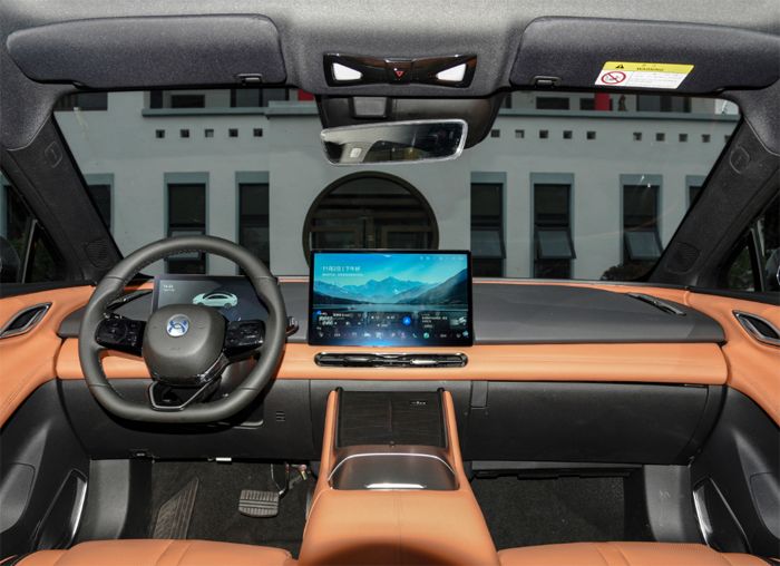内饰方面,合创A06采用对称式布局,设计风格极简,整个中控台仅有空调出风口设计,全部功能都集中在中控大尺寸触控屏之上,符合现在的流行趋势。14.6英寸中控触控屏搭载合创全新自研车机系统HI-OS,支持视线唤醒、唇动识别以及手势控制。另外,它全系标配高通8155芯片,让车机系统运行更流畅。