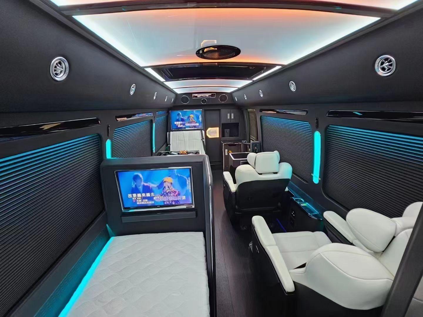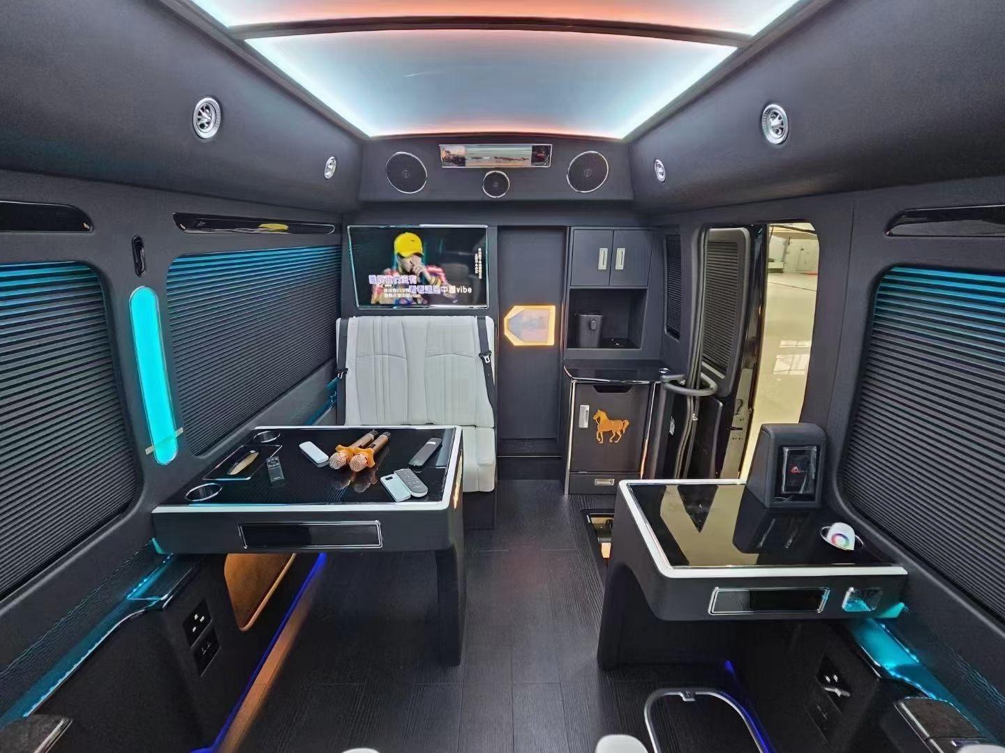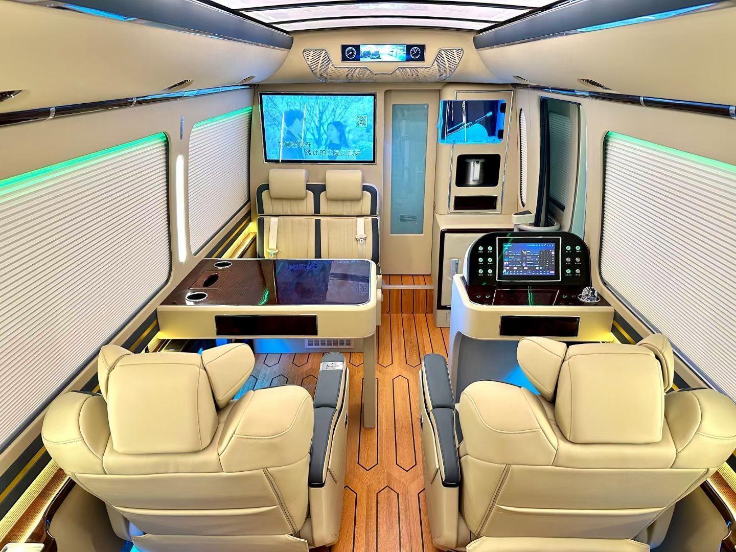 再来看一下商务款的布局,作为商务用途的车辆,12座是最受欢迎的款式。既能保证空间性,也可以保证整体的舒适性,和出行的人数。也是全隔断的布局,有两个反向座椅,大屏的电视机,卡拉OK的功能全部具备,还能商务会议。作为商务款,主要作用就是接待用车,企业招待,自己出行的高规格配置,走在路上也是炸裂的存在。配置高,款式好,整车都是真皮包覆,侧墙每个座位都是有无线充电和五孔的插座。