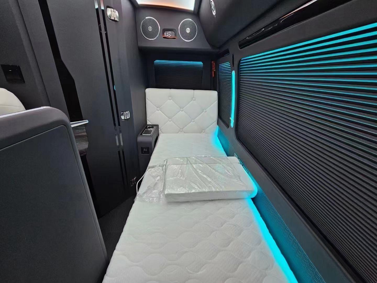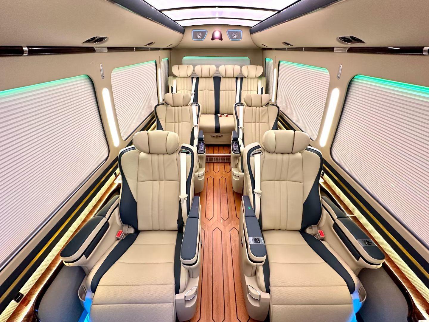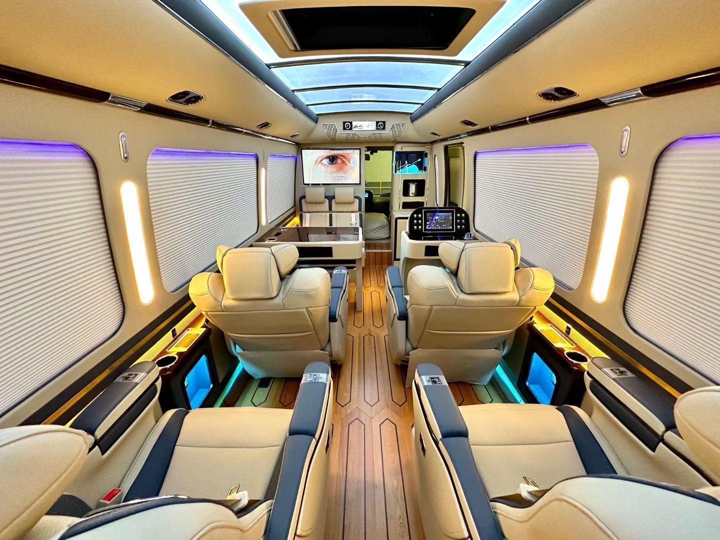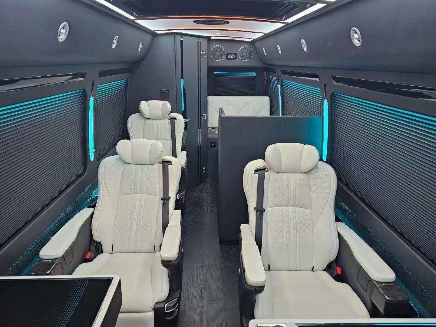 再来看一下商务款的布局,作为商务用途的车辆,12座是最受欢迎的款式。既能保证空间性,也可以保证整体的舒适性,和出行的人数。也是全隔断的布局,有两个反向座椅,大屏的电视机,卡拉OK的功能全部具备,还能商务会议。作为商务款,主要作用就是接待用车,企业招待,自己出行的高规格配置,走在路上也是炸裂的存在。配置高,款式好,整车都是真皮包覆,侧墙每个座位都是有无线充电和五孔的插座。