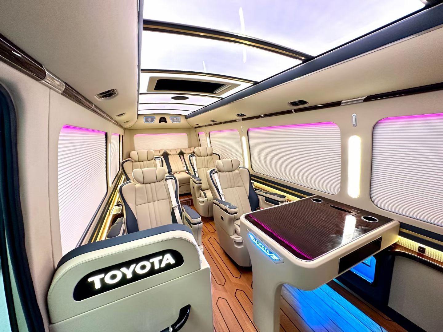 丰田考斯特12座的内饰设计是为了突出接待规格,使车内更加美观、更加舒适或者更能彰显一种尊贵的身份。丰田考斯特在内饰的改装上更加注重氛围的衬托,高档的豪华座椅,自动调节的百叶窗帘,车载影5.1声道音系统。丰田考斯特改装的独特之处。配备上高档的办公桌,在注重实用性的同时也可以满足我们办公或者旅途中吃饭的需要。贴心的设计是丰田考斯特中巴车能够被更多的人所珍惜的重要原因。