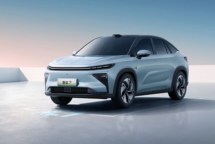 外观方面,睿蓝7整体采用轿跑SUV的外观设计,并采用了上下双色或纯色的车身设计,整体设计简洁。其拥有家族化的设计风格,前脸配备贯穿式的LED灯带以及分体式大灯,非常有辨识度,新车没有设计中网,前方LOGO采用了品牌新的标识,位于发动机盖之上。车型尺寸方面,新车长宽高分别为4690/1892/1650mm,轴距2775mm。车辆尾部,贯穿式尾灯样式与头灯呼应,整个车位也相对简洁,保险杠处的黑色装饰展现出跨界风格,尾部还有动感的扰流板设计。