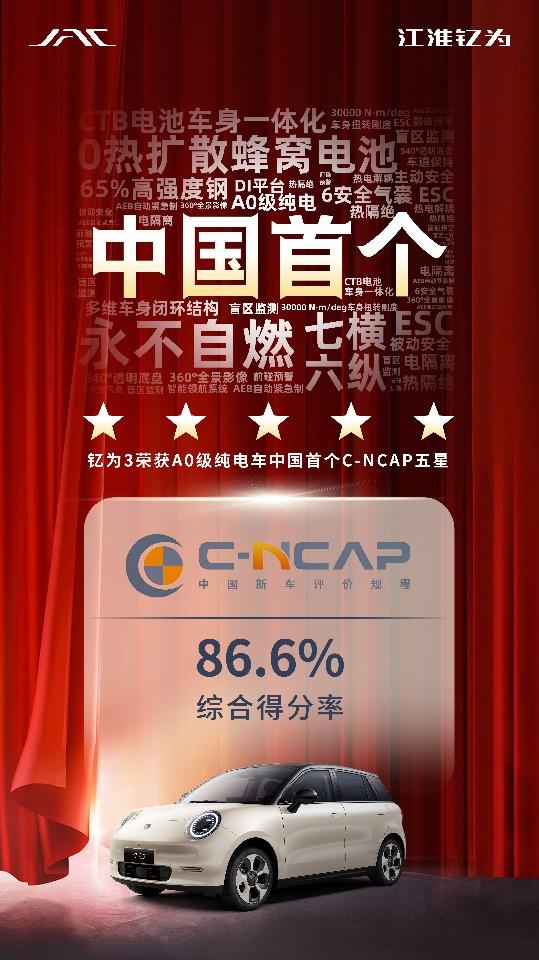 钇为3在安全方面表现优异,在不久前的中汽研新车安全测试中,是首个也是目前唯一一个获得C-NCAP五星安全认证的纯电A0级轿车。
