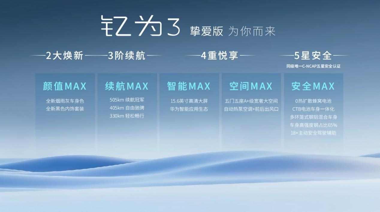钇为3挚爱版全维MAX进阶,为你而来。高颜值、长续航、真智能、超安全、大空间,你想要的统统给你。