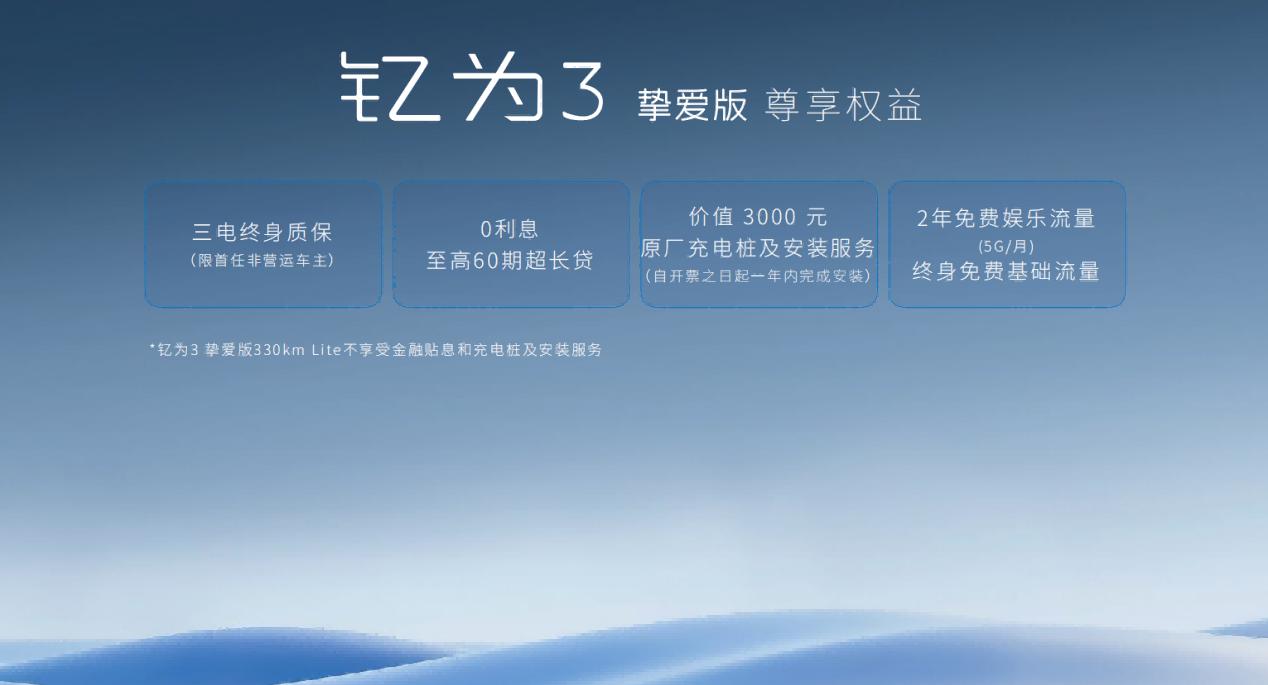 新增330km续航版型的钇为3挚爱版,价格来到了7万元-12万元区间,降低用户入手门槛的同时,在实力与品质上再次进化。作为全球首款真正意义上基于纯电平台打造的A0级车,“超安全智电守护者”钇为3挚爱版凭借MAX级的产品力,带给更多用户“智能、安全、愉悦”的出行体验。