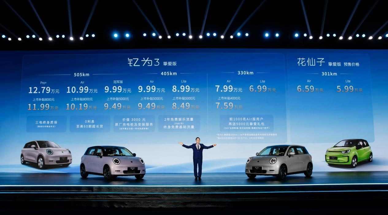 钇为3挚爱版上市的同时,有着超30万用户的花仙子系列也宣布推出挚爱版,续航301km,并同步开启预售,预售价格为5.99万元-6.59万元。钇为3和花仙子这对挚爱组合将在纯电小型车市场形成强有力的产品矩阵,为用户带来更多选择!