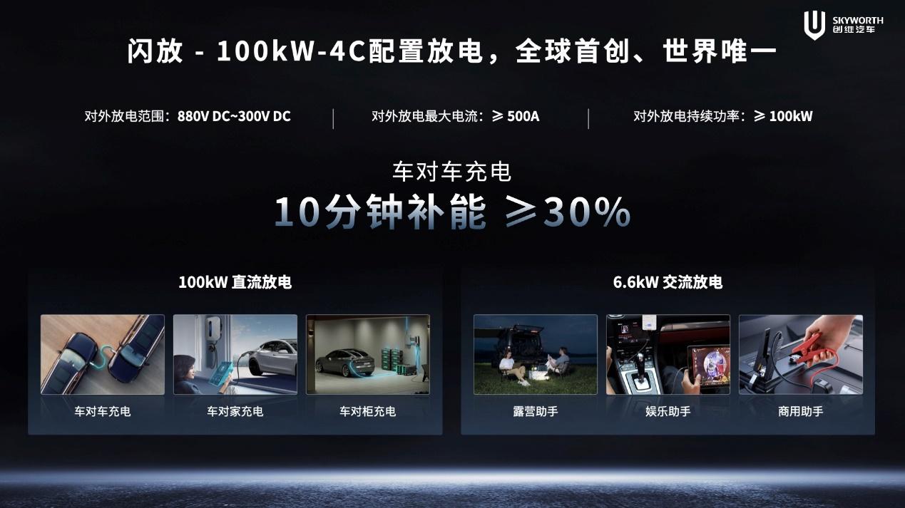 想要实现“光储充运一体化”体系,还离不开高效的车对车闪放能力。创维汽车重磅发布全球首创、世界唯一的100kW直流放电功能,车对车充电10分钟即可补能超30%。此技术可实现800V DC-300V DC的对外放电范围,最大放电电流大于500A,对外放电持续功率达100kW以上。依托于此,创维EV6 Ⅱ超充车型可拓展出更加丰富的用车场景,如车对车充电、车对家充电、车对柜充电等,是全球第一部移动补能车。相较于现有补能车,综合使用成本更低,且机动灵活不受限。