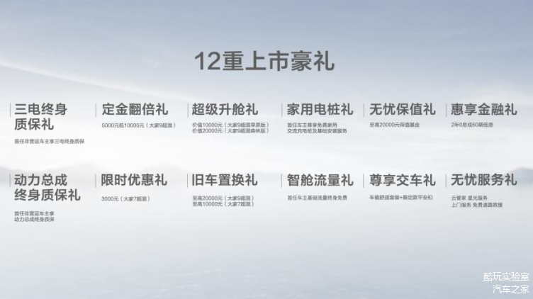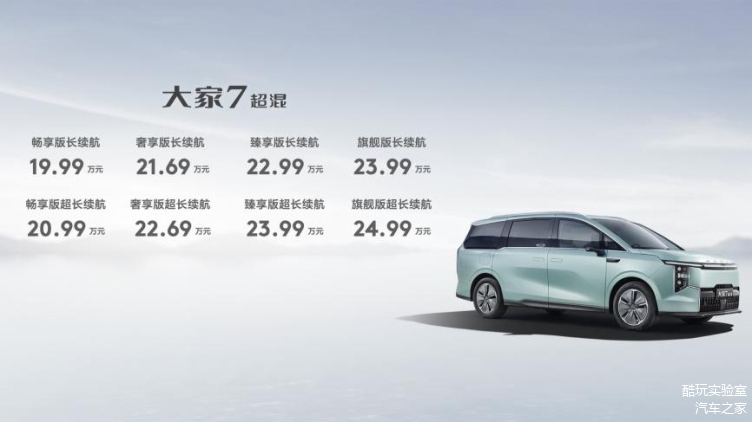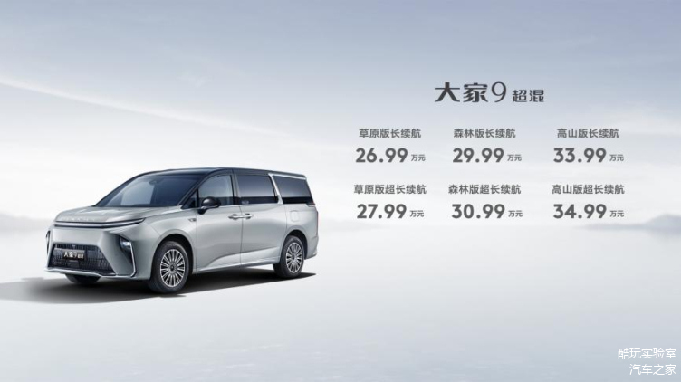 同样给足惊喜的还有诚意的价格:大家9超混长续航版售价26.99万元起,超长续航版27.99万元起;大家7超混长续航版售价19.99万元起,超长续航版20.99万元起。极具竞争力的价格之外,两款车型还为用户带来了丰富“壕礼”:即日起,选购大家9超混、大家7超混即可享三电和动力总成终身质保,首批车主还可享至高5000抵10000元定金翻倍礼、至高20000元换购补贴、至高20000元保值基金,同时还有智舱流量、家用电桩、无忧服务等12项加码权益。超预期的产品、超预期的价格、超预期的车主福利,“大家”系超混诚意拉满,以20多万起售的价格,给用户带来了40万级越级的、满配的、超值的、尊贵的体验,展现出了卓越的质价比。超混MPV时代未来已来,“大家”系超混将引领全球豪华MPV市场新潮流和新风向,也将为全球中高端多人出行用户带来更优质的新选择和新体验。