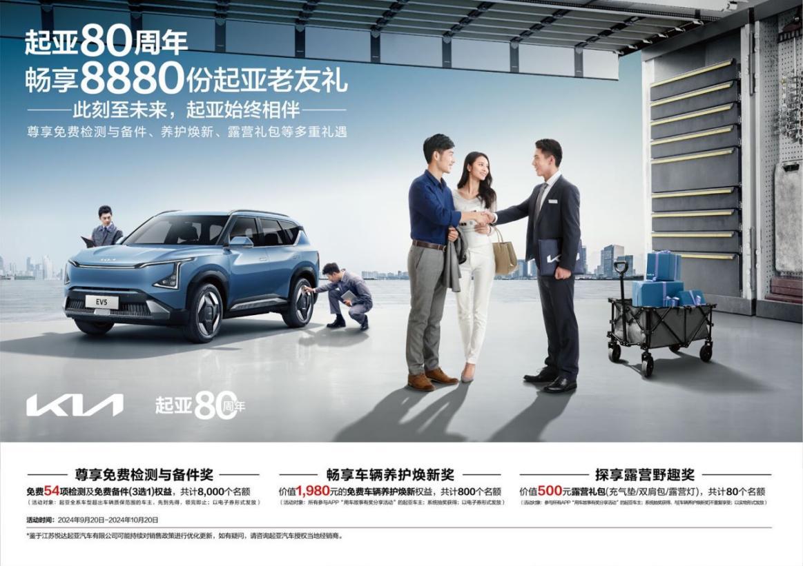 一路有你,不负所期。为感谢一直以来老用户朋友们对起亚品牌的支持与信赖,9月20日,“此刻至未来,起亚始终相伴——起亚80周年用户感恩”活动正式启动,推出了“尊享免费检测与备件奖”、“畅享车辆养护焕新奖”、“探享露营野趣奖”等8,880份起亚老友礼,通过悦达起亚官网、起亚Kia服务号、起亚Kia APP等官方平台即可参与活动。