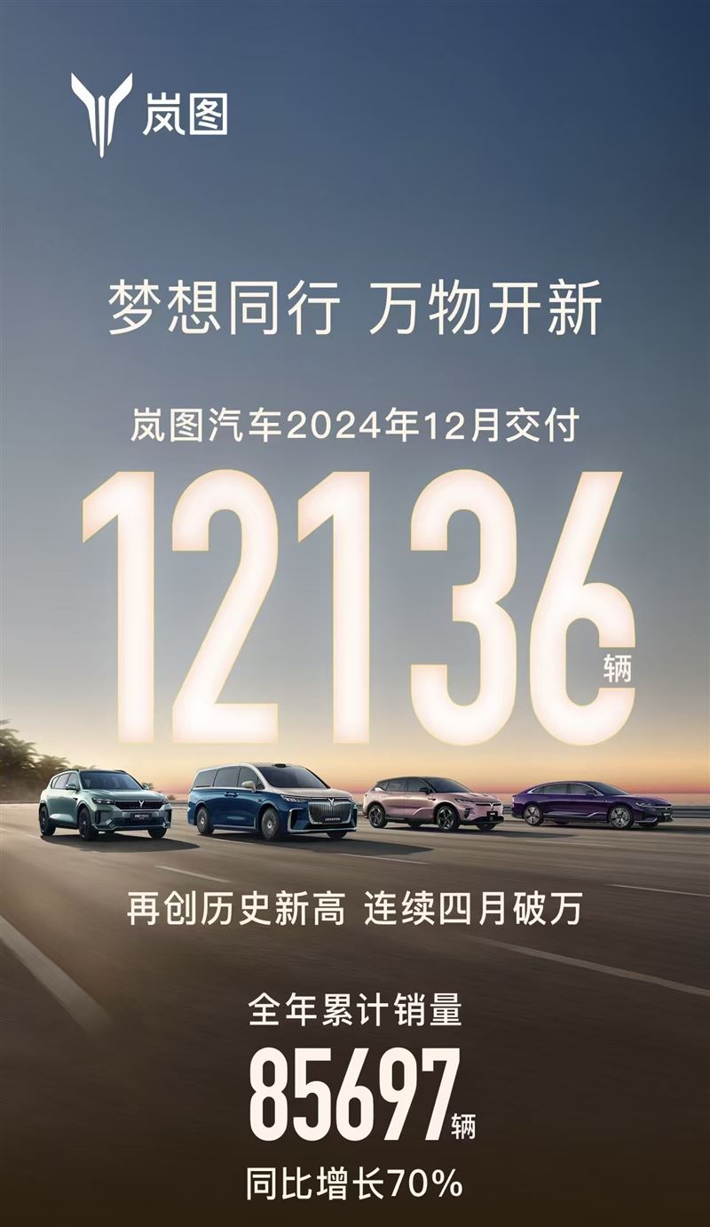 9月焕新上市后,全新岚图梦想家甚至没有经过口碑发酵期,上市即上量,销量一路看涨,直至问鼎细分市场销冠。2024年12月,岚图汽车交付新车达到了12136辆,同比增长21%,并且连续四个月跻身“万辆俱乐部”,全年更是实现了销量“八连涨”的优异成绩。1-12月,岚图汽车累计交付85697辆,同比增长70%。
