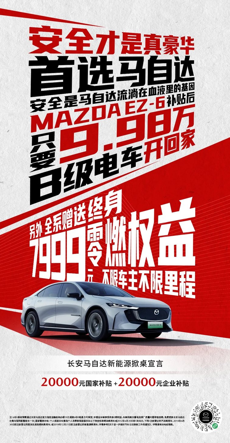 MAZDA EZ-6以“安全+品质+价格”三重颠覆,重新定义新能源竞争逻辑。其浅色内饰的焕新与购车政策的诚意,不仅是对用户需求的精准回应,更标志着合资品牌以“中国智造”重构市场格局的决心。“只要9.98万,B级电车开回家”,长安马自达正以“不妥协”的姿态,为消费者开启高品质新能源生活的全新篇章。